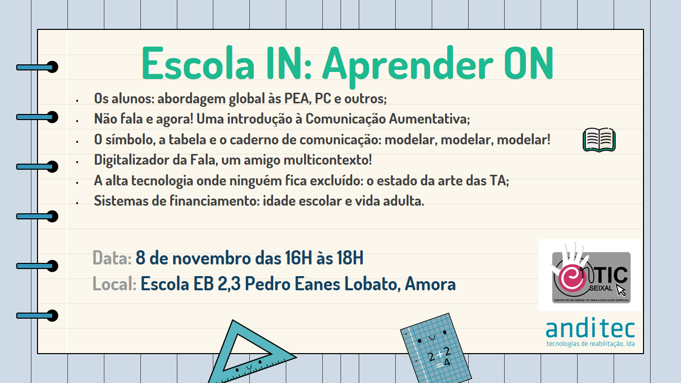 O CRTIC Seixal vai organizar em parceria com a Anditec, no dia 8 de novembro, 3ª feira, pelas 16.00h o Workshop "Escola IN: Aprender ON" sendo a formadora a Engª Sara Rodrigues.